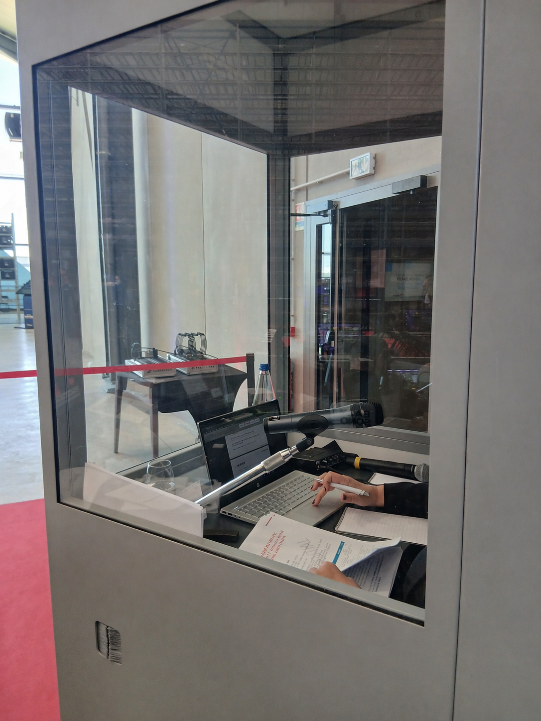 Cabine d’interprétation simultanée pour la gestion des traductions en direct.
